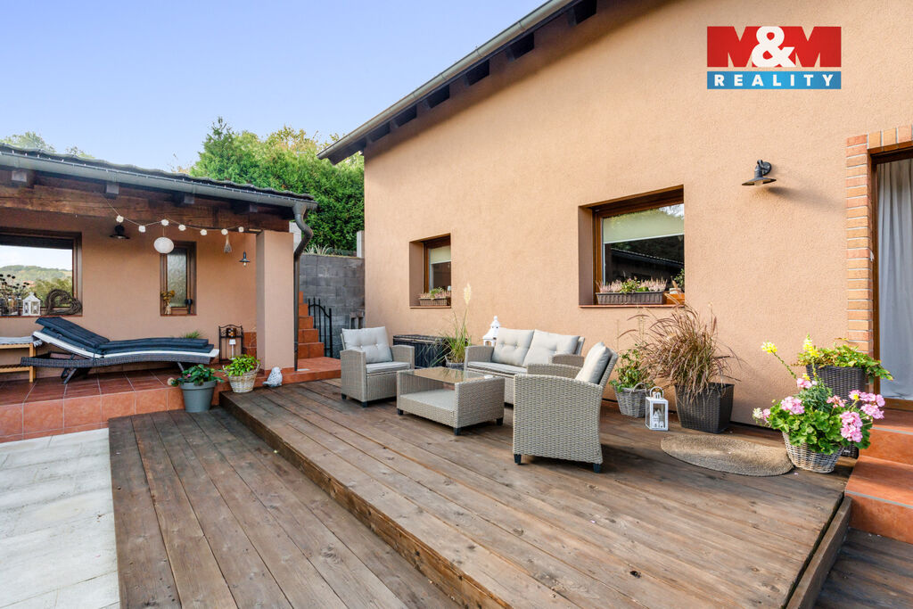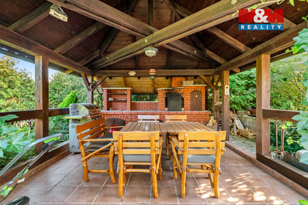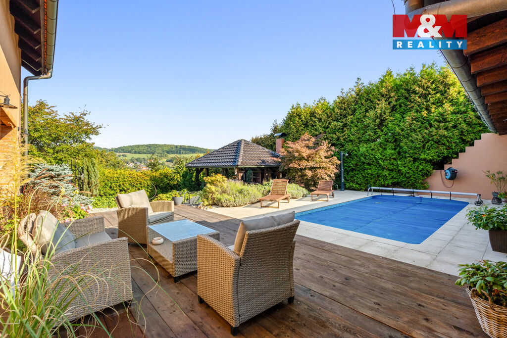 Sníte-li o bydlení v klidné a lukrativní lokalitě, tak Vás zveme do vyhledávané obce Chuderov do exkluzivního rodinného domu o zastavěné ploše 157 m2 na pozemku o rozloze 848 m² s výhledem do krásného okolí. Hlavní obývací část v přízemí zahrnuje plně vybavenou kuchyň se spižírnou, vstup na terasu, odkud se Vám otevře výhled na zahradu s jezírkem, pergolu s grilem, krbem, bazénem, solární sprchou a velkým bonusem je sauna, bar, kuchyňka, sprcha a WC v samostatné stavbě. Z předsíně jsou samostatné vstupy do pokoje, koupelny se sprchovým koutem a WC, technické místnosti, skladu a garáže. Ve druhém podlaží naleznete čtyři neprůchozí pokoje, koupelnu s vanou a samostatným WC. Velká půda vybízí k vybudování dalších obytných prostor. Dům se střešní krytinou - glazovaný Tondach, je vybaven moderními technologiemi jako podlahové topení, klimatizace a centrální vysavač, vnitřní a venkovní rolety, kazetové dveře a vlastní čistička. Přijďte se určitě podívat. Těšit se na Vás bude Bohuš a Zuzka