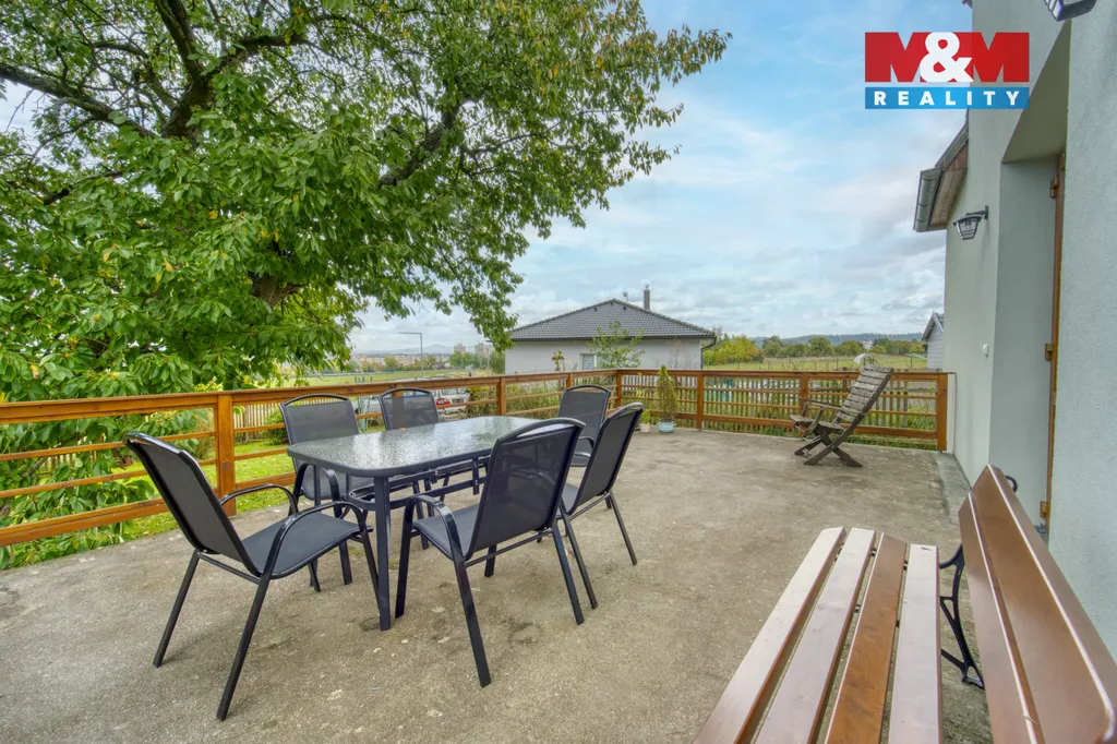 Dominantou domu je velká zděná terasa s nádhernými výhledy do okolní zeleně – ideální místo pro ranní kávu, rodinné večeře nebo večerní relax.