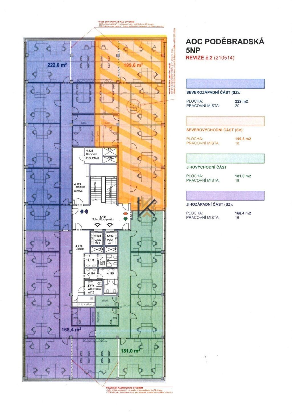 Bez provize! Nabízíme k pronájmu kanceláře o celkové ploše 199,6 m² v nově dokončené budově Park Poděbradská (2020) ve vyhledávané lokalitě Praha 9 – Vysočany, které disponují otevíratelnými okny, klimatizací, zdvojenými podlahami, centrální recepcí, vstupy na čipové karty a osobními i nákladními výtahy. Tento zcela nový komplex nabízí nájemcům kvalitní prostory na velmi dobře viditelném a dostupném místě, přičemž zastávka tramvaje je jen pár minut chůze, stejně jako stanice metra a vlakové nádraží Libeň. Areál poskytuje dostatečnou kapacitu venkovních parkovacích stání