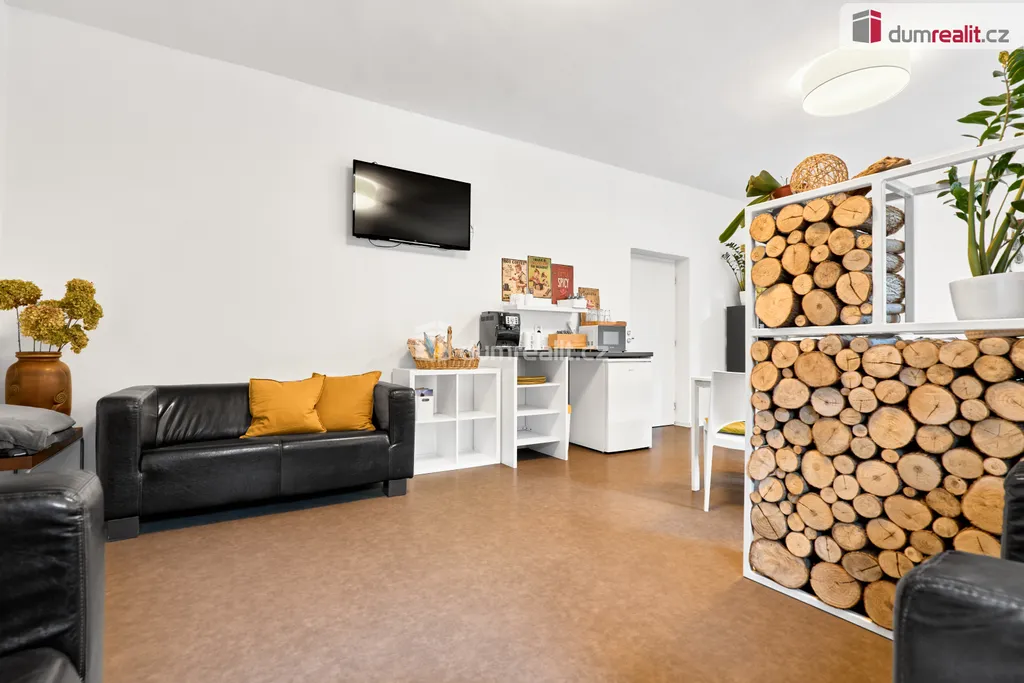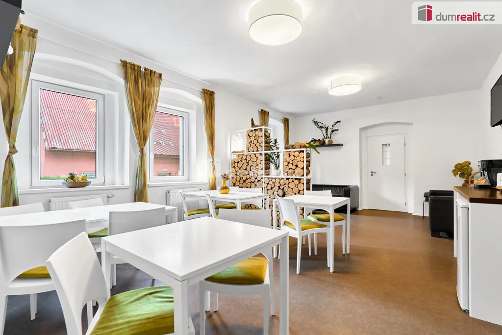 V přízemí domu je společenská místnost a jídelna v jednom, kuchyň, spíž, technická místnost, WC rozdělené na dámské a pánské, 1 samostatný pokoj a 1 pokoj s vlastním sociálním zařízením.