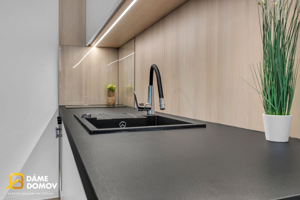 Byt je zařízen kvalitním nábytkem na míru s dostatkem úložných prostor. Prostorná koupelna se sprchovým koutem, komora s prostorem na pračku (sušičku), součástí bytu je rovněž sklep. Kuchyň je vybavena vestavěnou ledničkou, troubou a dvouplotýnkovou varnou deskou.