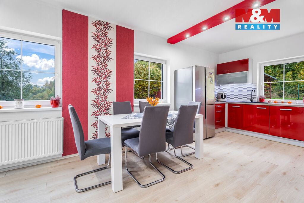 A právě takový domov vám chceme představit. Přízemní dům s obytným podkrovím v Markvarticích je situován na slunném místě nad vesnicí s výhledem do údolí říčky Bystrá. Jeho dispozice 5+KK uspokojí až 5-ti člennou rodinu. Velký pozemek pak udělá radost nejen vám, ale i vašim chlupáčům. Prostorná garáž zase ukryje váš vůz i hodně vašich pokladů. U vytápění si můžete vybrat, zda si zatopíte v krbu s výměníkem a vychutnáte si atmosféru hořícího dřeva nebo jen zapnete elektrický kotel a ušetřený čas věnujete třeba čtení knížky.
