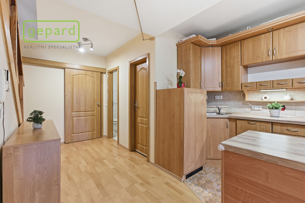 V patře jsou tři samostatné místnosti a velmi prostorná koupelna s vanou, sprchovým koutem, WC i bidetem. Z koupelny vede další místnost, která slouží, jako technické zázemí (pračka, sušička ap.). Dále se v patře nachází další úložná komora s výlezem na půdu.