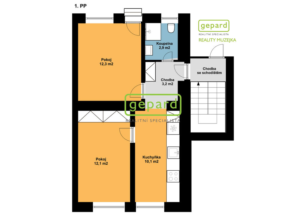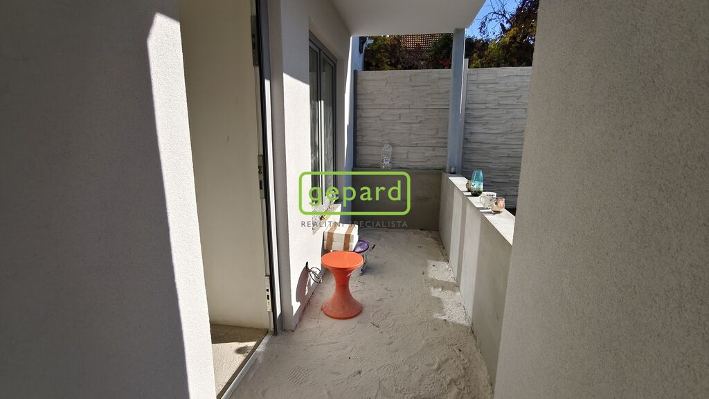 Byt je umístěný ve sníženém přízemí a je tvořen předsíní, koupelnou se sprchou a WC, kuchyní, dvěma pokoji a malou teráskou orientovanou do zahrady. Je vybaven kuchyňskou linkou se spotřebiči (indukční varná deska, horkovzdušná elektrická trouba, digestoř, mikrovlnná trouba, lednice s mrazákem, myčka) a pračkou. Vytápění stropními infrapanely, v koupelně je elektrický žebřík, ohřev vody elektrickým boilerem. Byt bude připravený k nastěhování od prosince. Vhodné pro 2 osoby.
