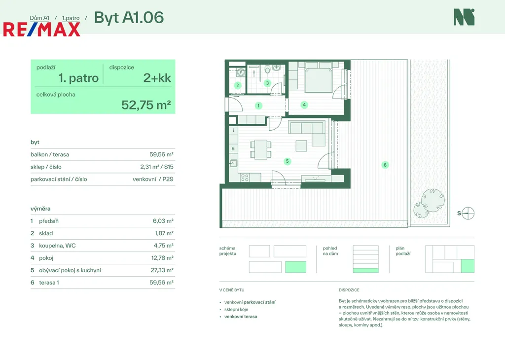 Nabízený byt A1.06 se nachází ve zvýšeném přízemí domu A1. Užitná plocha samotného bytu je 55,51 m2 plus 59,56 m2 terasy plus 2,31 m2 sklep. Slunná a prostorná terasa je orientována jihozápadním směrem. Součástí ceny je i vnější výhradní parkovací stání.