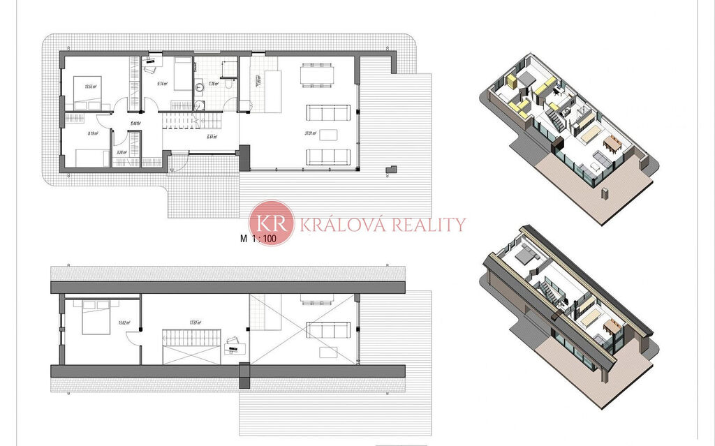 Dům se rozkládá na dvou podlažích a nabízí velkorysé obytné prostory a umožňuje chytré uspořádání. V přízemí najdete prostorný obývací pokoj, který se skládá z velké jídelny a obývacího pokoje s velkými okny, která zaplavují interiér přirozeným světlem. Moderní kuchyň je vybavena vším, co potřebujete k přípravě svých oblíbených jídel. V patře se nachází spací část s příjemnými a světlými ložnicemi. Každá místnost je navržena tak, aby zajistila klidný a relaxační odpočinek díky důrazu na detail a použití kvalitních materiálů.