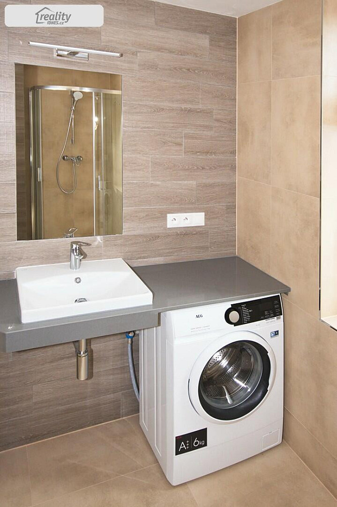 Plně vybavená kuchyňská linka s vestavěnou lednicí a vestavěným mrazákem. Koupelna je vybavená pračkou, sprchovým koutem a WC.