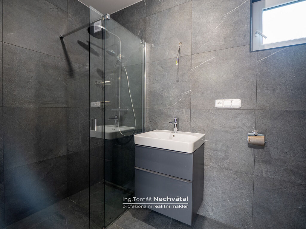 Kvalitní vinyl s příjemným povrchem v obytné části, v koupelně pak moderní velkoformátová dlažba. Celek podtrhují vysoké interiérové dveře, které prostor krásně otevřou a dodají mu pocit vzdušnosti.