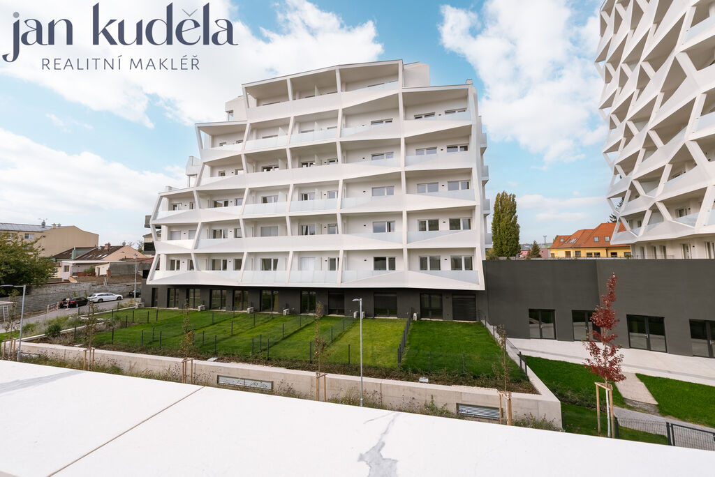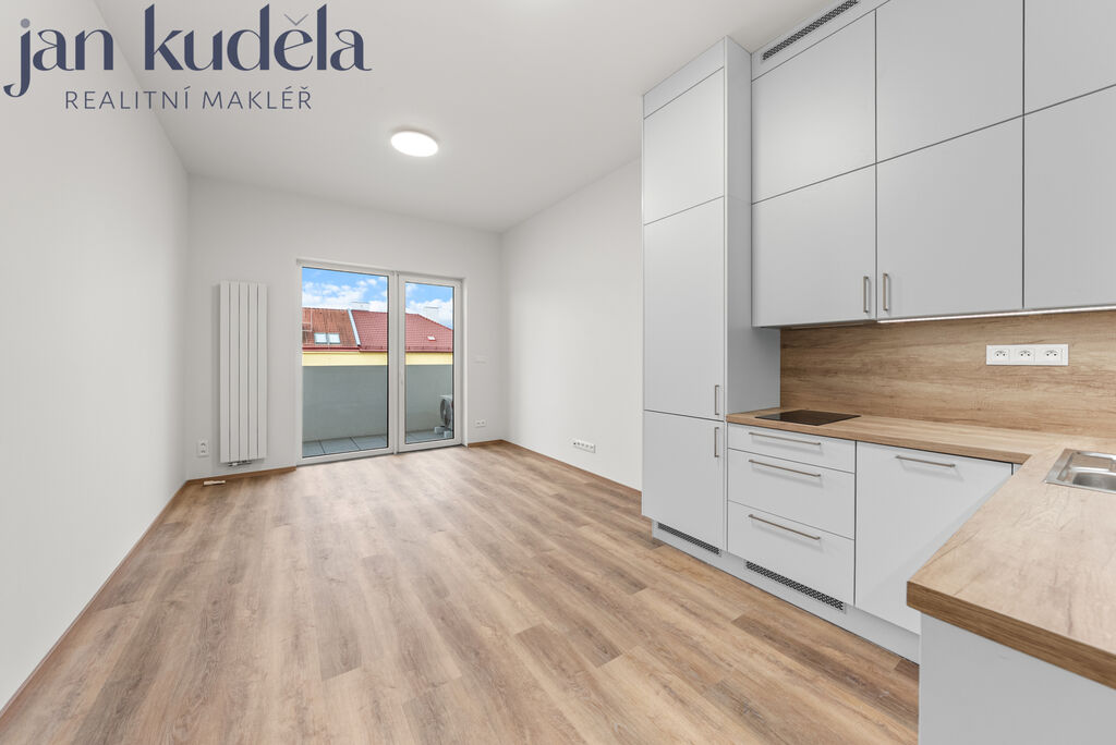 Nabízíme k pronájmu nový a světlý byt o dispozici 1+kk o celkové podlahové ploše 33,4 m2 včetně terasy 4,9 m2, umístěný v 5. nadzemním podlaží bytového domu Meridiem. K bytu náleží také prostorný sklep.