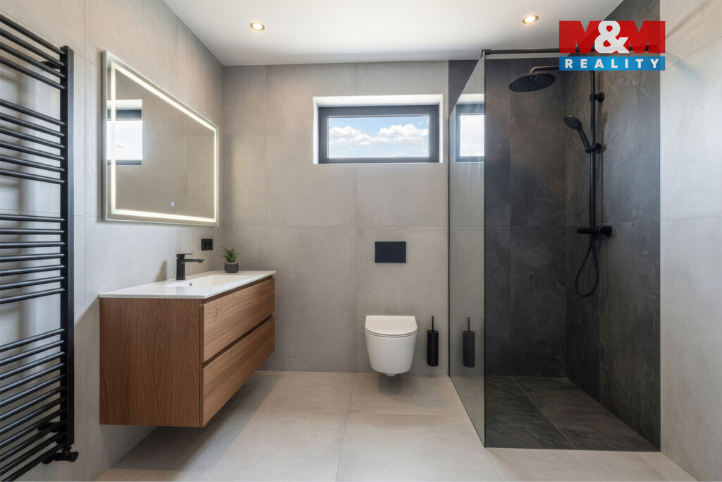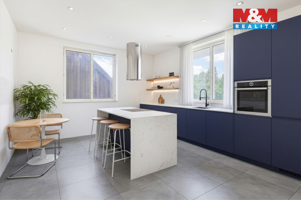 Dispozice nabízí orientačně pět obytných místností a další prostory v mezipatrech, které lze flexibilně upravit dle potřeby. Pozemek po rozdělení geometrickým plánem bude mít cca 1 000 m², je oplocený a parkování je možné v garáži v suterénu i na pozemku. K dispozici je elektřina na hranici pozemku, vlastní studna (se spoluvlastnickým podílem) a je nutné vybudovat čističku odpadních vod.
