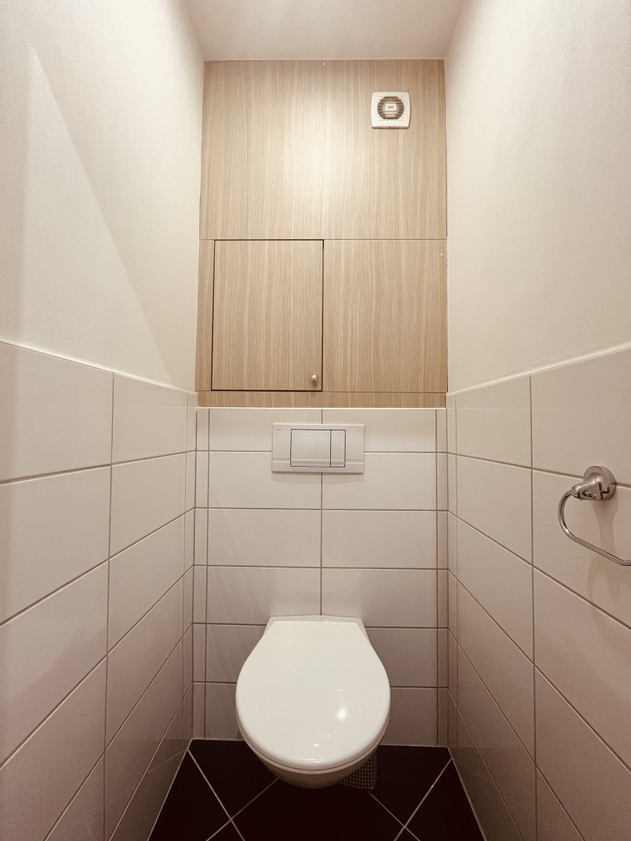 Koupelna disponuje sprchovým koutem s umyvadlem, koupelnovou skříňkou a žebřinovým topením.. Toaleta je umístěna samostatně.