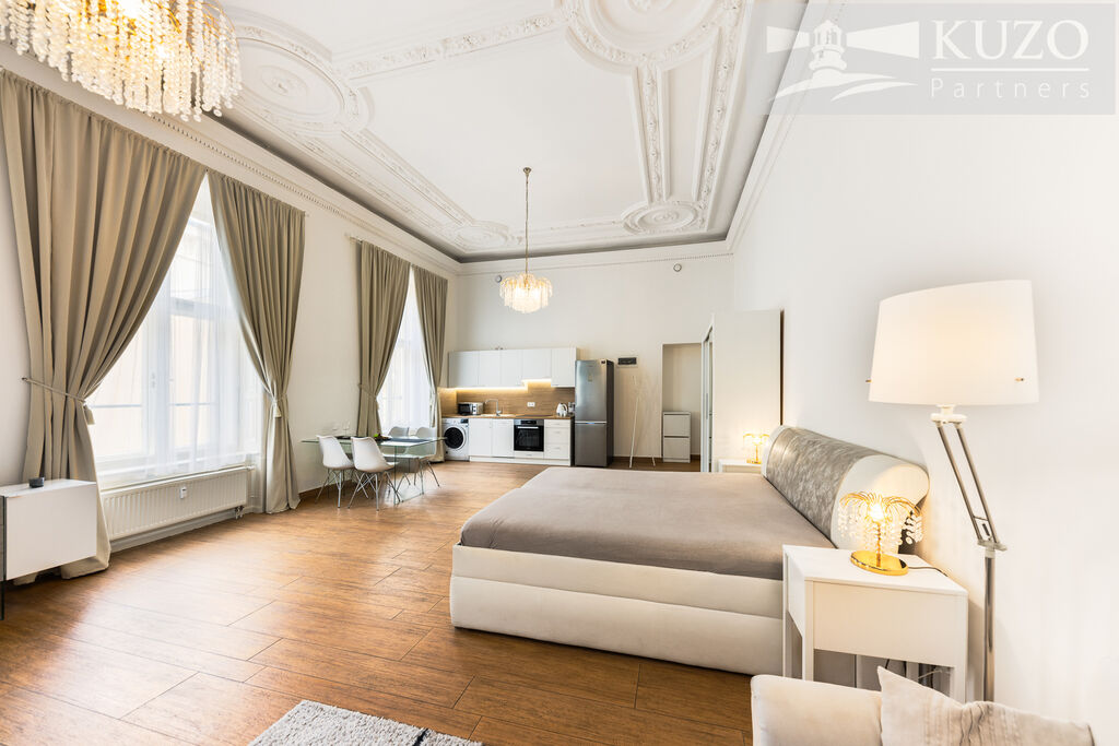 kompletní vybavení: kuchyňská linka s vestavěnými spotřebiči, kvalitní nábytek, křišťálové lustry – byt je připraven k okamžitému užívání