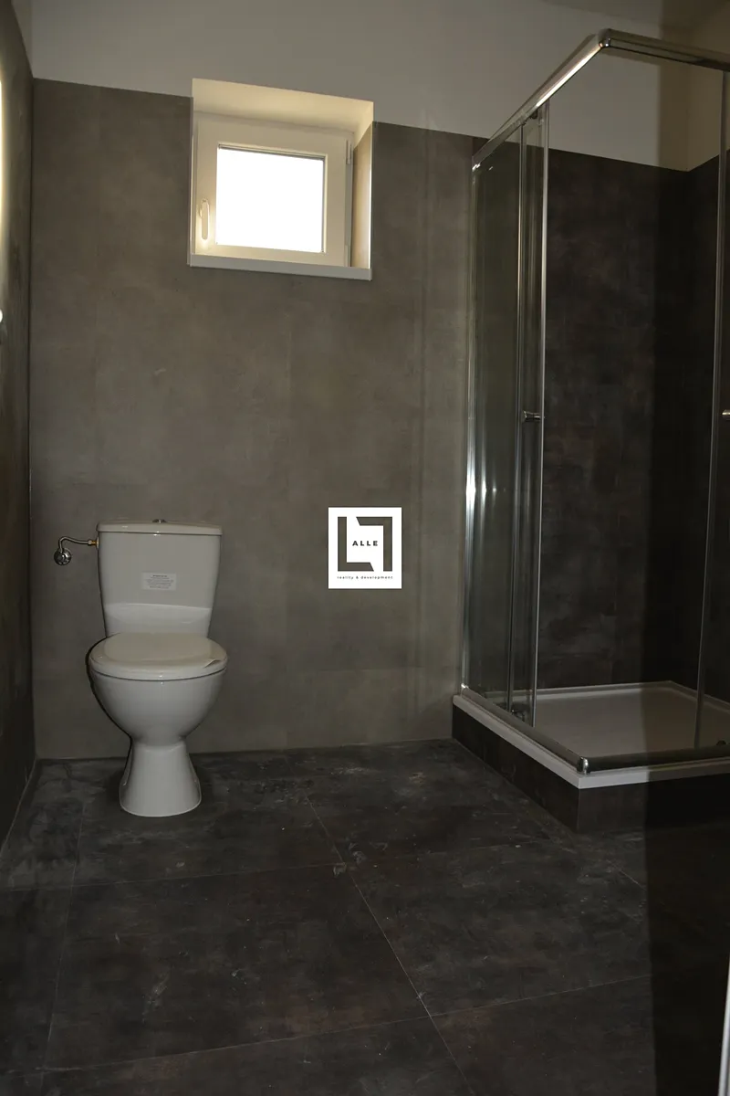 V koupelně se nachází sprchový kout, umyvadlo, toaleta, otopný žebřík, baterie.