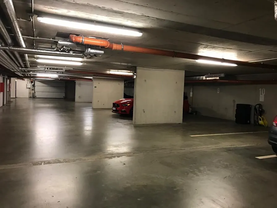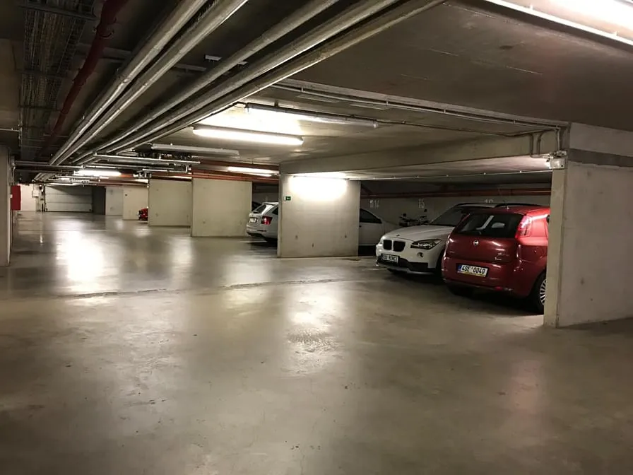 Garážové stání se nachází v 1.podzemním podlaží bytového komplexu postaveném v r. 2009. Vjezd do garáží je z boku komplexu pomocí automatických elektrických vrat ovládaných na čip. Maximální výška vozidla je 2m. V garážích jsou umístěné kamery. Měsíční poplatek je 353Kč (elektřina, pojištění, úklid...)