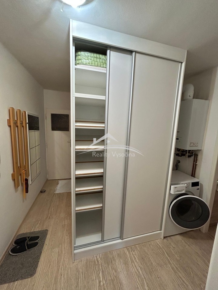 Dispozice zahrnuje zděné jádro s koupelnou vybavenou sprchovým koutem a splachovacím WC, komoru a sklepní kóji. Kuchyň je osazena zánovní linkou s vestavěnými spotřebiči – elektrickým sporákem, horkovzdušnou troubou a digestoří, dále je k dispozici pračka a lednice s mrazákem.