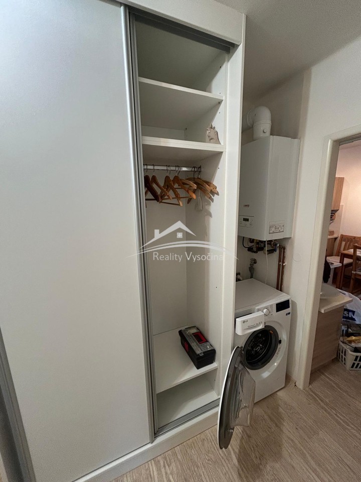 V ložnici se nachází manželská postel a skříně, v obývacím pokoji pak obývací stěna, rohová sedací souprava a konferenční stolek. Vytápění je zajištěno vlastním plynovým kotlem, který zároveň ohřívá teplou vodu.