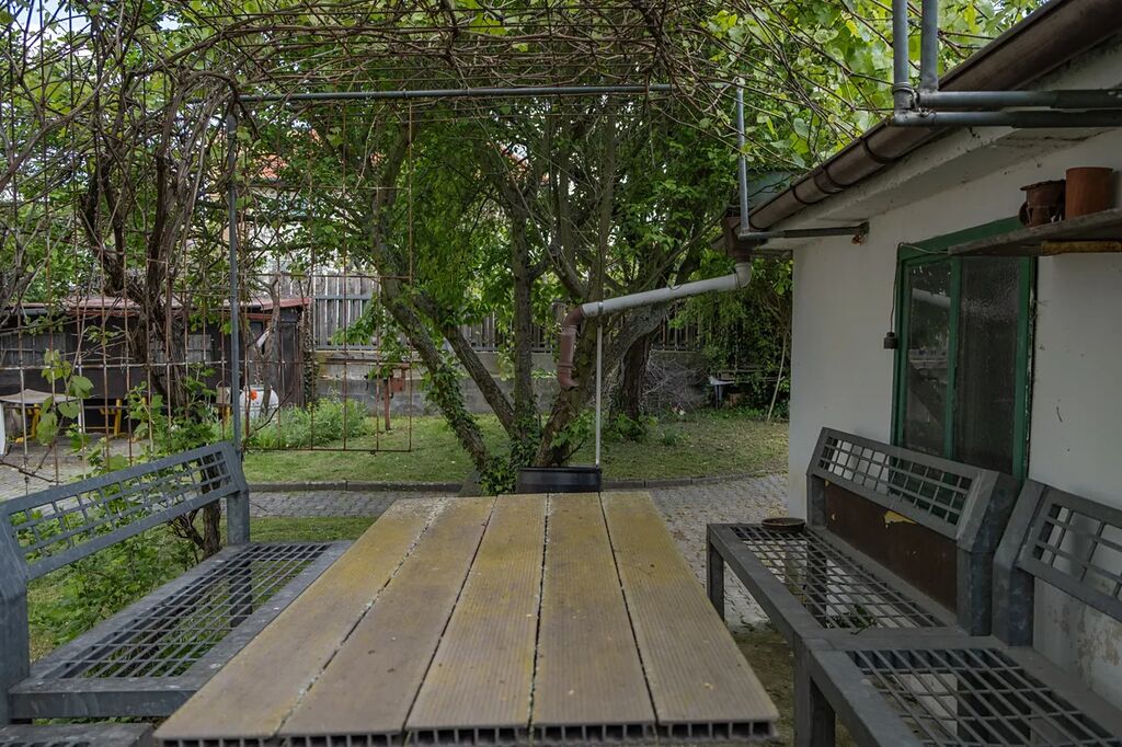 Zahrada za domem nabízí příjemné soukromí pro relaxaci, rodinné posezení i dostatek místa pro případné další parkování.