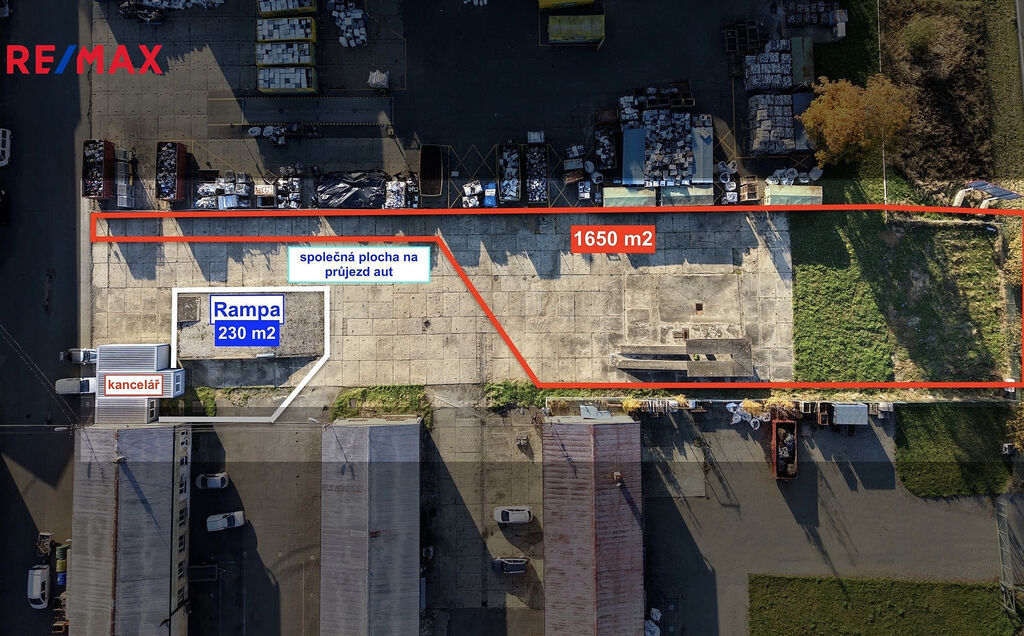 Součástí plochy je betonová rampa, zatravněná plocha o výměře 305 m² (dá se jakkoliv využít, popř. upravit na náklady nájemce)