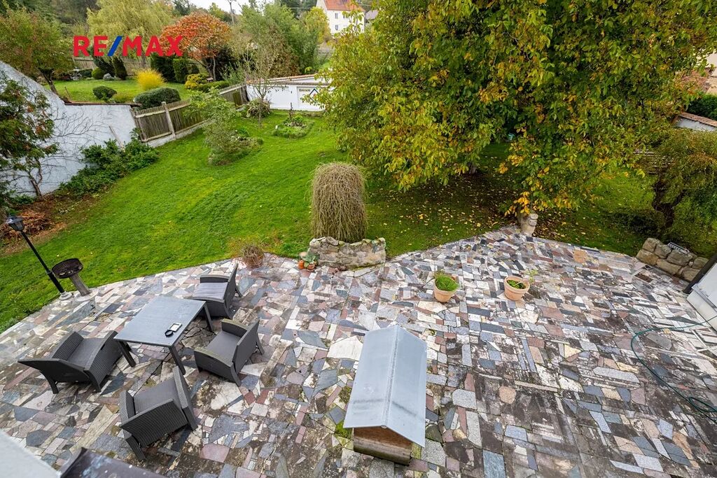 Za domem se rozprostírá udržovaná okrasná zahrada o celkové ploše 1 015 m², které dominuje vzrostlý ořech.