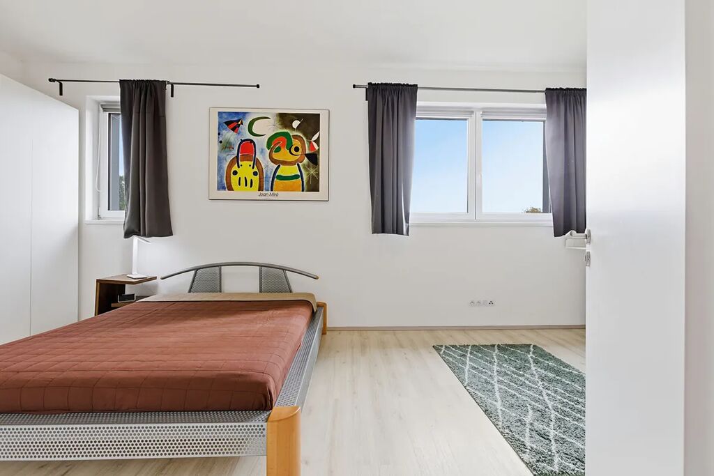 Dispozici bytu tvoří menší vstupní hala, schodiště do velké vstupní haly (17,5 m²) se skladem (3 m²) a vstupy do ložnice (21 m²), obývacího pokoje propojeným s kuchyní a jídelnou (55 m²), koupelny s toaletou a sprchovým koutem (5 m²) a průchozí šatny (8 m²) do ložnic (21 m²) a (20 m²) a druhé koupelny s WC a vanou (5 m²).