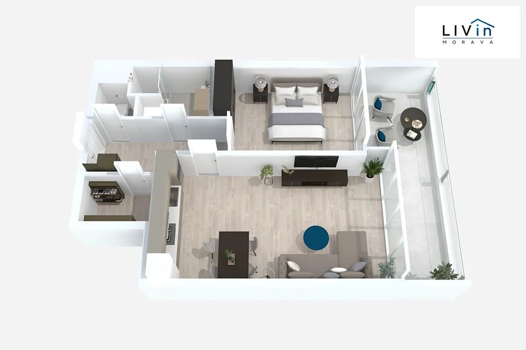 Byt je složen z chodby, obývacího pokoje s kuchyní, ložnice, šatny, koupelny, samostatného WC a terasy.