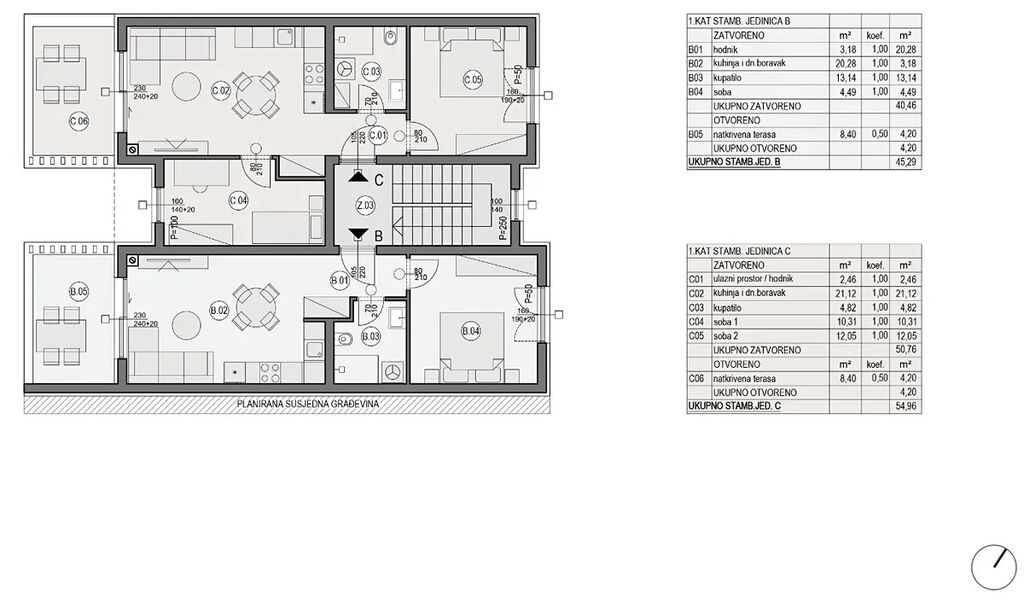 Byt B s dispozicí 2kk se nachází v 1. patře budovy A.