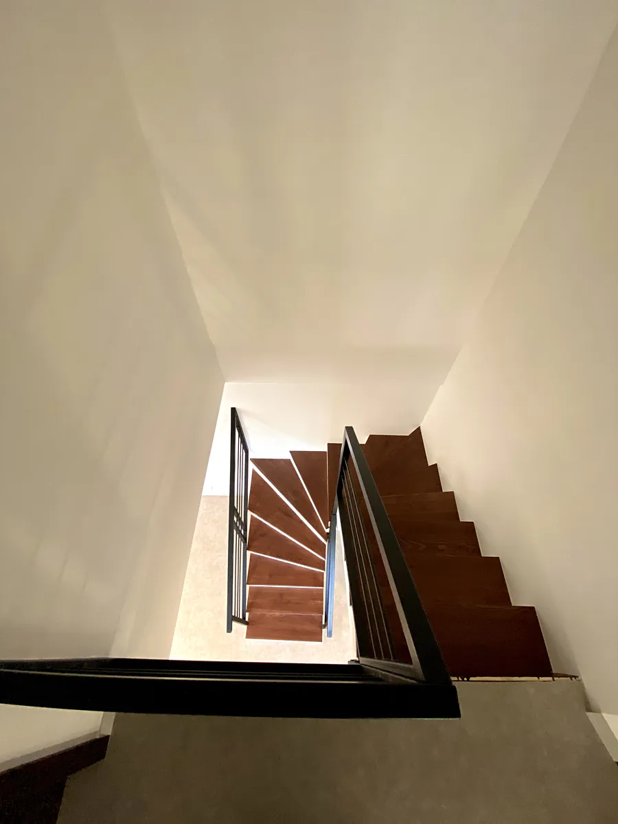 spodní patro=obývací pokoj s kuchyňskou linkou a výklenkem pro jídelní stůl,