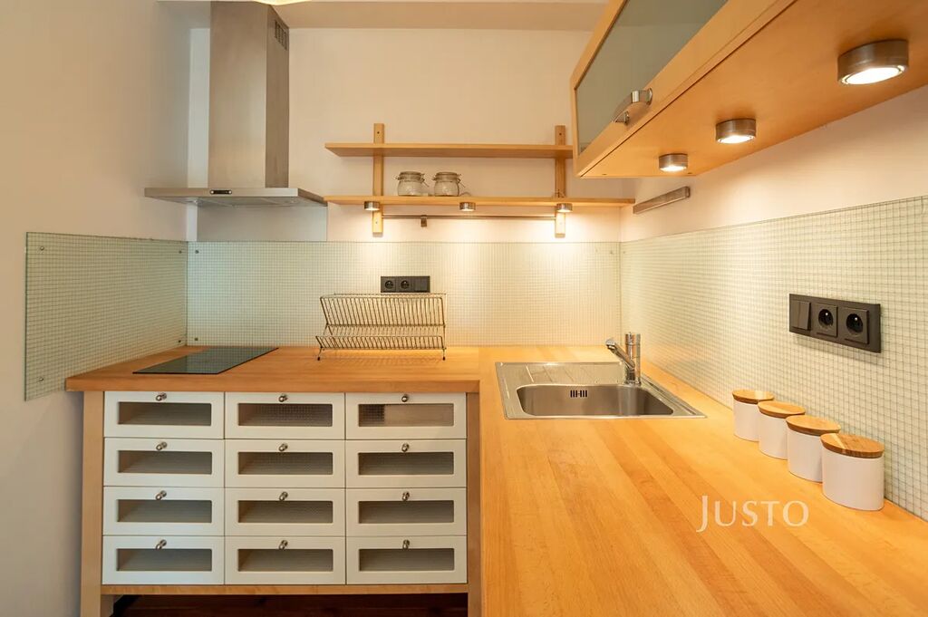● Kuchyňská linka je vybavena sklokeramickou varnou deskou, digestoří, lednicí s mrazákem, myčkou a mikrovlnnou troubou. Hned vedle kuchyňského koutu je jídelní stůl se 4 židlemi.