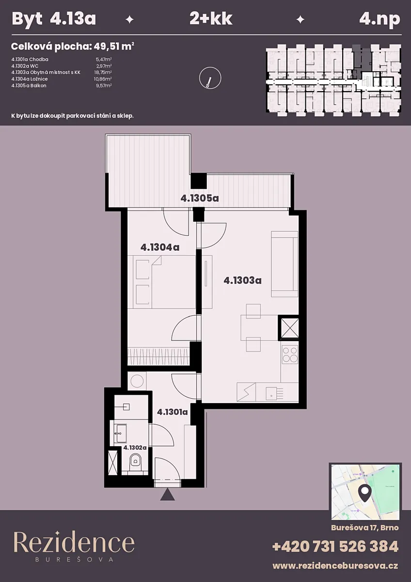 Nabízíme k prodeji moderní byt 2+kk o podlahové ploše 39,94 m2 s balkonem 9,31 m2 nacházející se v námi připravovaném projektu Rezidence Burešova v atraktivní lokalitě Veveří. Byt se nachází ve 4.NP, orientace bytu do vnitrobloku, jižní strana. K bytu lze koupit parkovací místo v zakladači i sklad.