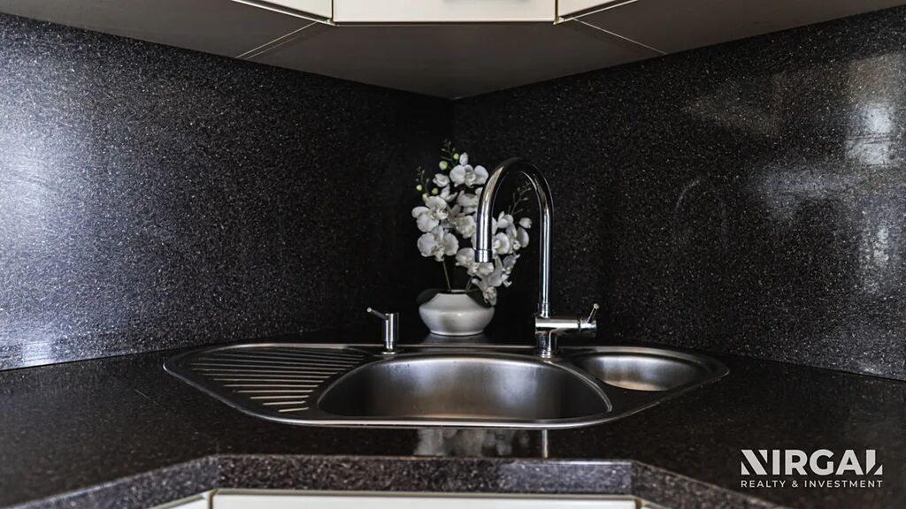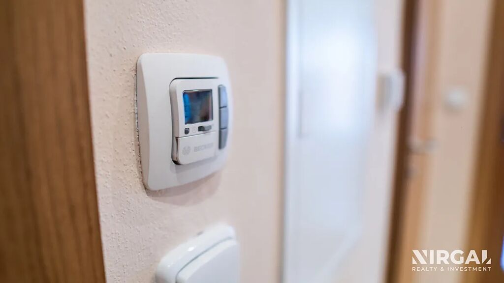 Byt má samostatnou toaletu s umyvadlem, prostornou koupelnu s rohovou vanou a podlahovým topením, a velkou komoru/šatnu v předsíni. K vybavení patří také elektrické venkovní žaluzie a bezpečnostní systém včetně bezpečnostních dveří.