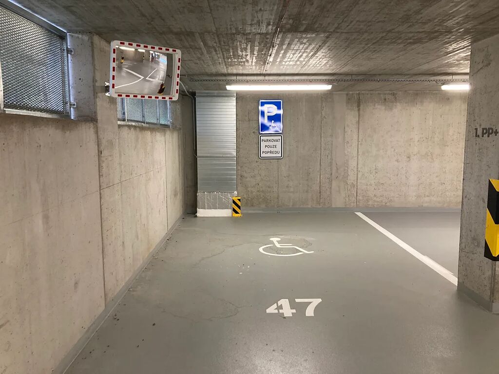 Exkluzivní nabídka dlouhodobého pronájmu nadstandardně širokého garážového stání. Možno parkovat vedle auta i 1-2 motorky či menší vozík. Garážové stání se nachází v novostavbě parkovacího domu, dokončeného v r. 2022. Vjezd je monitorován kamerovým systémem, vrata na dálkové ovládání, pěší přístup do garáží zvlášť přes samostatné dveře. Garážové stání je na úrovni vjezdu.