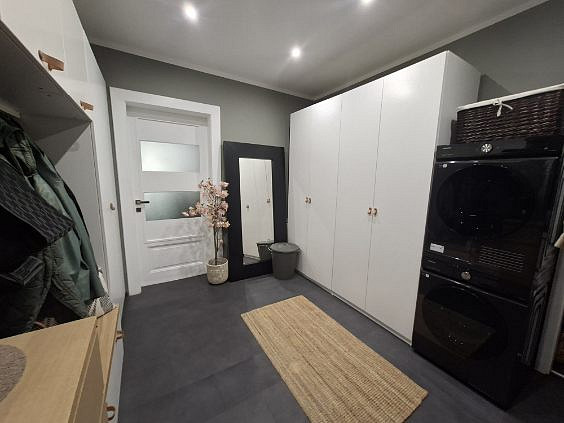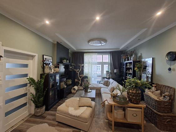 V ceně bytu zůstává většina zařízení - celá kuchyň vč.stolu židlí, nábytek v obýváku vč.domácího kina, celá sestava chodby, šatna, ložice nebo dle dohody a požadavků zájemce. K bytu náleží zděný sklep cca 6m². Dům novou střechu, vchodové dveře, schránky,stoupačky, do budoucna je plánovaný venkovní výtah. Před domem je oplocená předzahrádka s květinami, za domem se pak nachází dvůr se zelení.