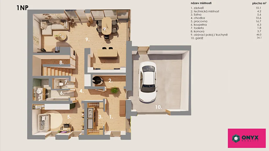 Celková užitná plocha domu činí 242,5 m². Součástí nabídky je terasa ze sibiřského modřínu o velikosti 50 m² a na ni navazující zahrada o výměře 200 m². Pozemek má celkovou rozlohu 501 m².