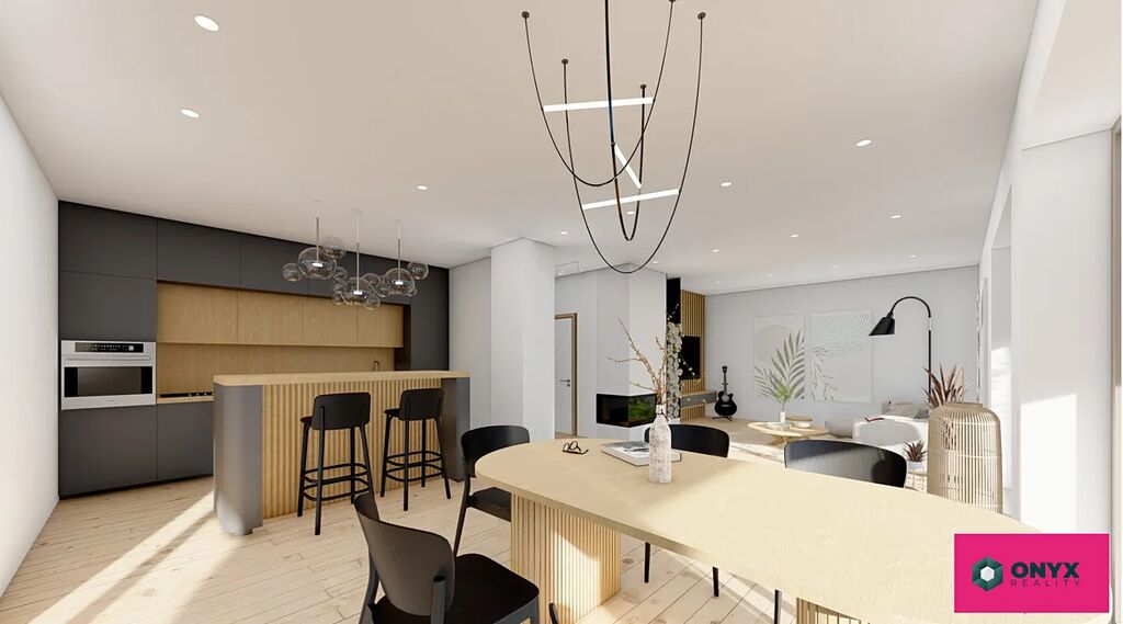 Nabízíme ke koupi velký moderní, nízkoenergetický - ve Třídě A - rodinný dům se dvěma plnohodnotnými podlažími, rovnou střechou a propracovaným dispozičním řešením. Dům disponuje šesti obytnými místnostmi, velkým obytným prostorem (obývací pokoj s kuchyní o velikosti 46 m² s prosklenou stěnou do "L" s přímým vstupem na terasu s HS portálem), třemi koupelnami, třemi toaletami a dvougaráží. Praktickým bonusem je samostatná prádelna s velkým francouzským oknem.