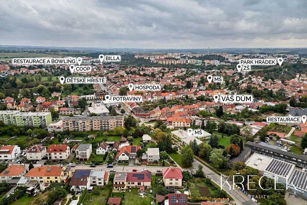 Lokalita nad historickým centrem Třebíče nabízí skvělé spojení klidného bydlení a výhod města. Jen pár minut pěšky od baziliky sv. Prokopa a Židovského města, přitom s plnou občanskou vybaveností doslova na dosah – školka, škola, lékař, obchody, restaurace i kavárny. Zastávka MHD je hned před domem a do samotného centra se dostanete pěšky za pár minut nebo autem do dvou minut. V okolí je také spousta možností pro volný čas – procházky k rybníku Zámiš, cyklostezka kolem Polanky nebo klidné cesty podél řeky Jihlavy směrem k Poušovu. Místo, které má všechno – město, historii i přírodu – na jednom místě.