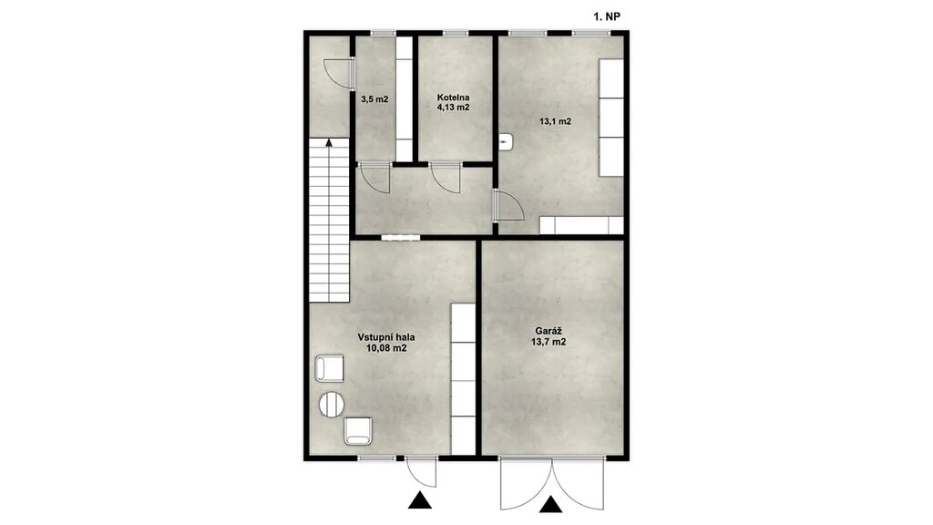 V přízemí se nachází prostorná vstupní hala, garáž, dvě technické místnosti a sklep.