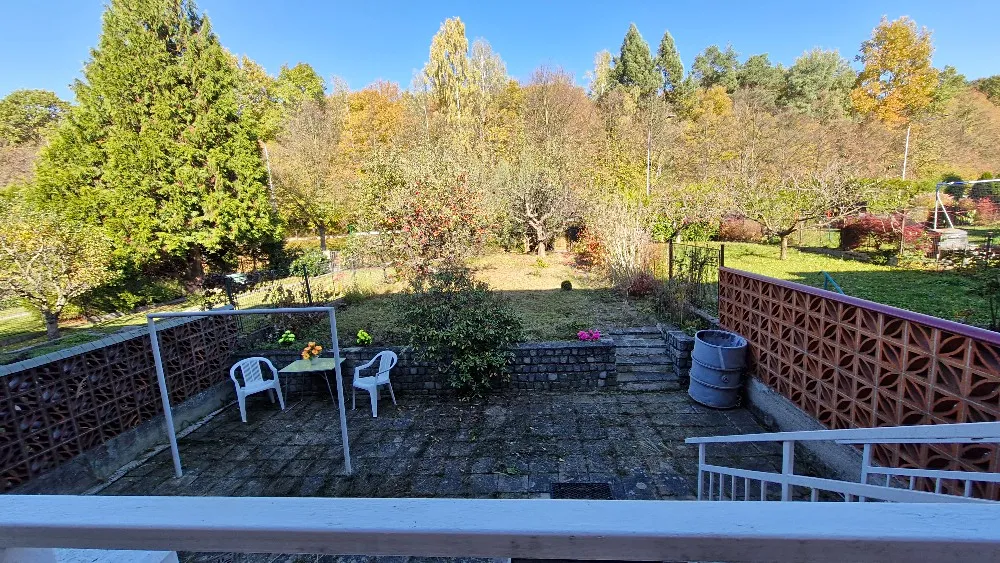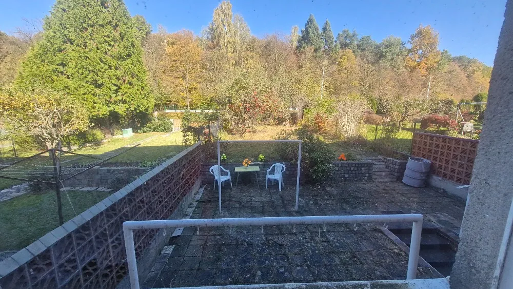 Za domem se rozprostírá okrasná zahrada a dvě jabloně. Terasa je dlážděná, s přípojkou vody a sušákem na prádlo.