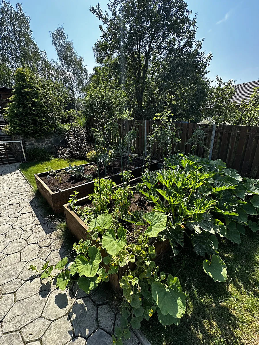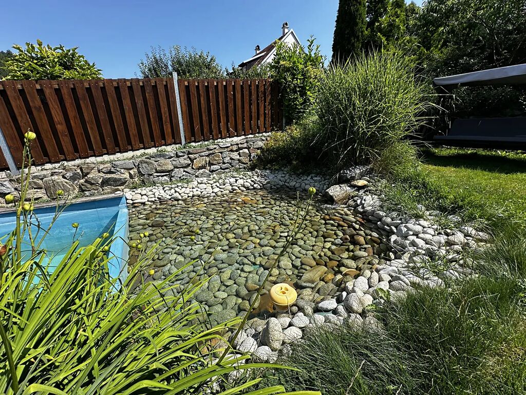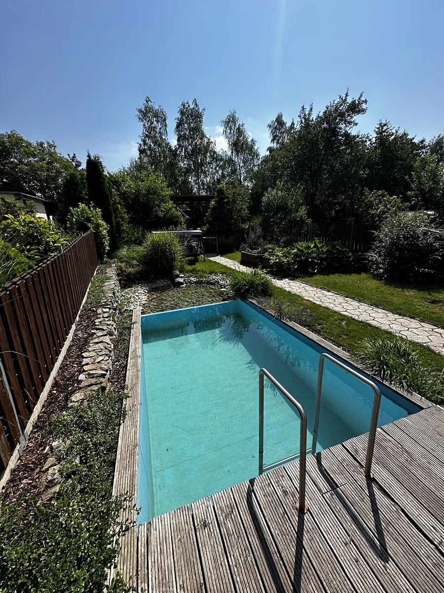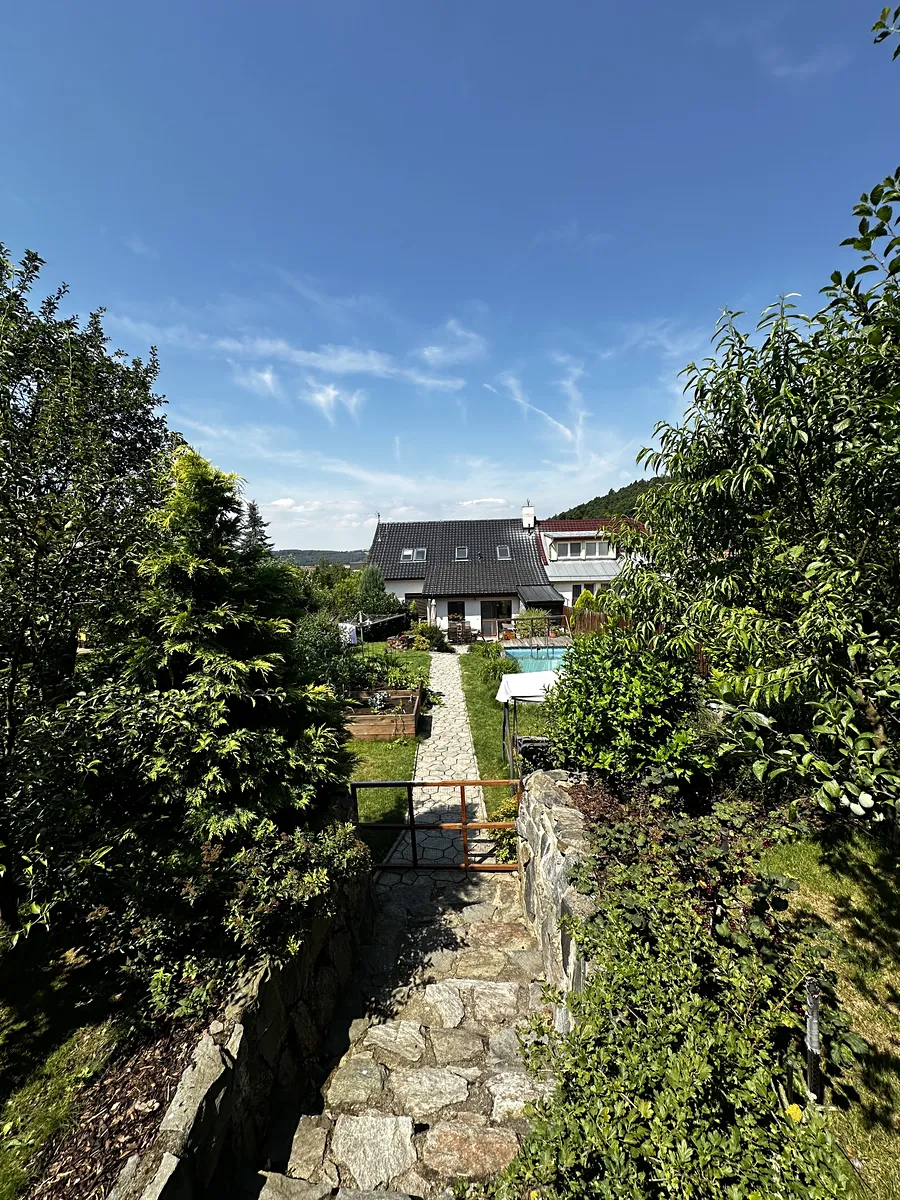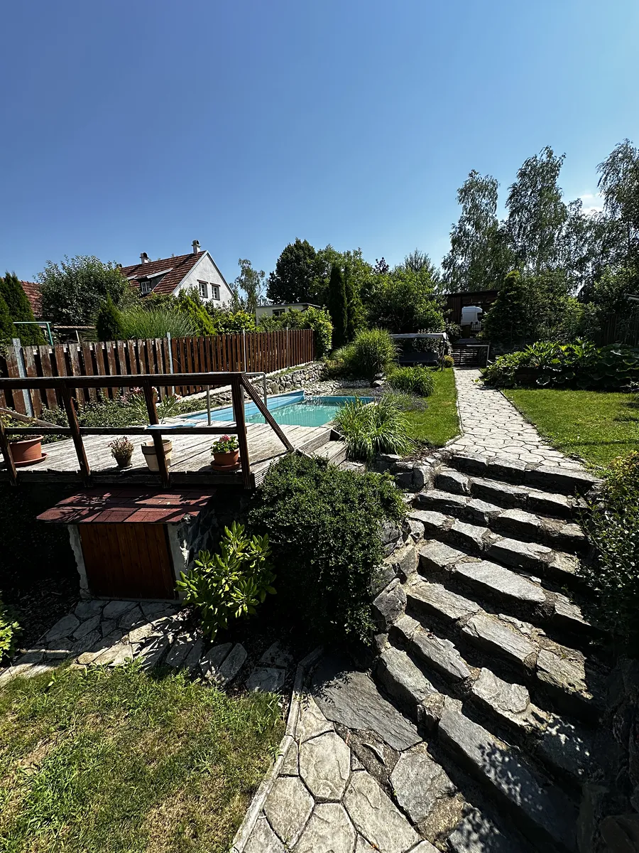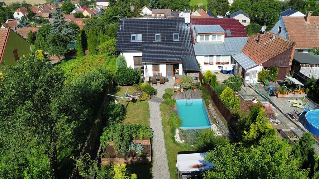 Velkou předností nabízeného RD je jižně orientovaná zahrada o ploše 321 m², s bazénem, na něj navazujícím jezírkem a prostorem k posezení u velkého jídelního stolu. Na zahradě je prostor pro pěstování Vaší oblíbené zeleniny a bylinek. Na východní straně zahrady se nachází kryté parkovací stání a prostorná domácí dílna (25 m²), kterou můžete použít k uskladnění kol po výletu na jedné z mnoha cyklotras v místních lesích, které začínají doslova za dveřmi.