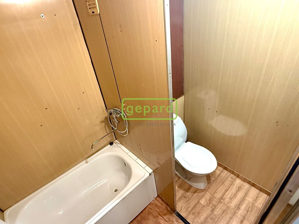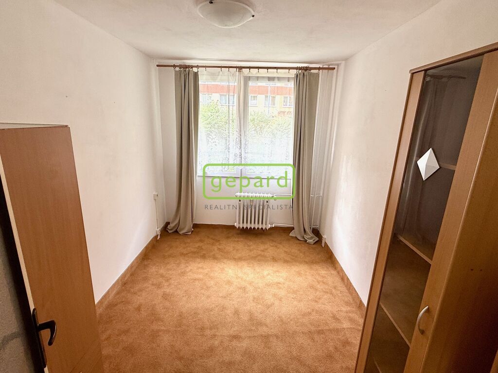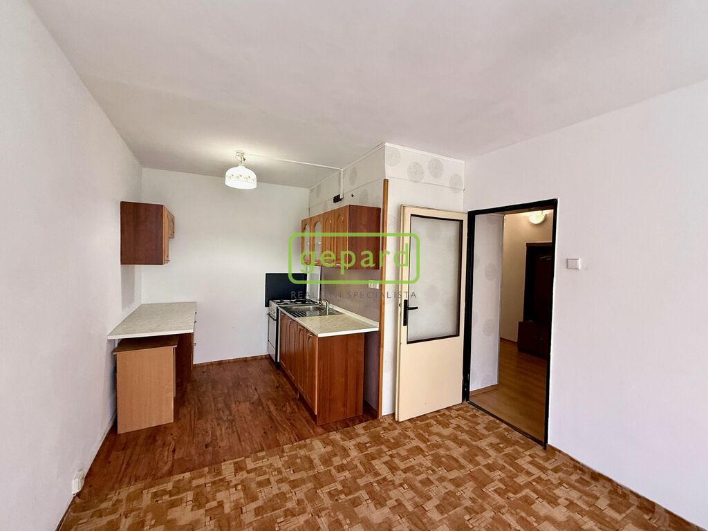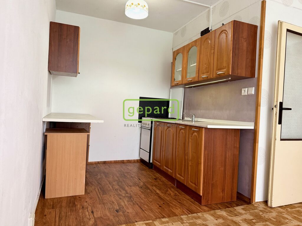 Obývací pokoj je propojený s kuchyňským koutem a vstupem na velký balkon táhnoucí se přes oba pokoje. Ložnice nabídne klidné zázemí. Koupelna s WC je v původním umakartovém provedení – funkční, ale ideální pro ty, kdo si chtějí byt postupně doladit podle svého vkusu.