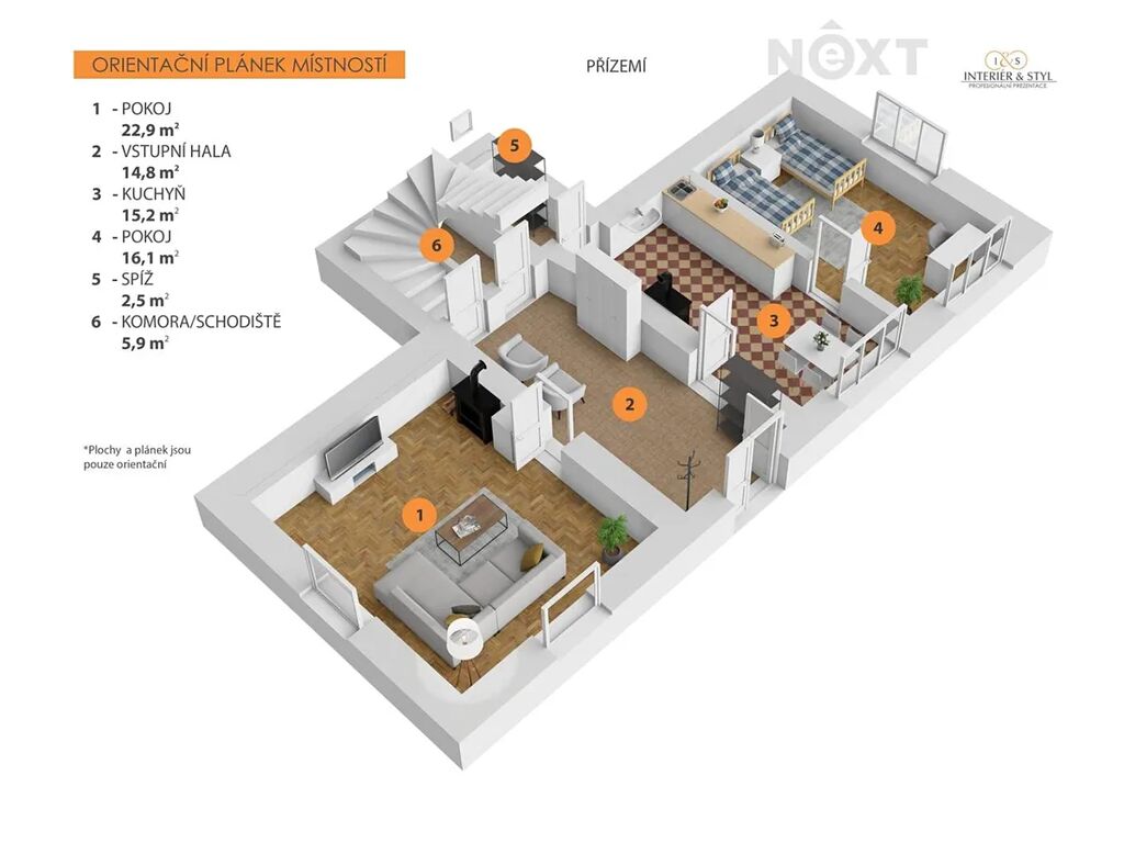 Rodinný dům před kompletní rekonstrukcí si zachoval svůj venkovský ráz. Nabízí obytné přízemí o dispozici 2+1 s podlahovou plochou cca 77 m² a prostornou půdu o ploše přibližně 70 m².