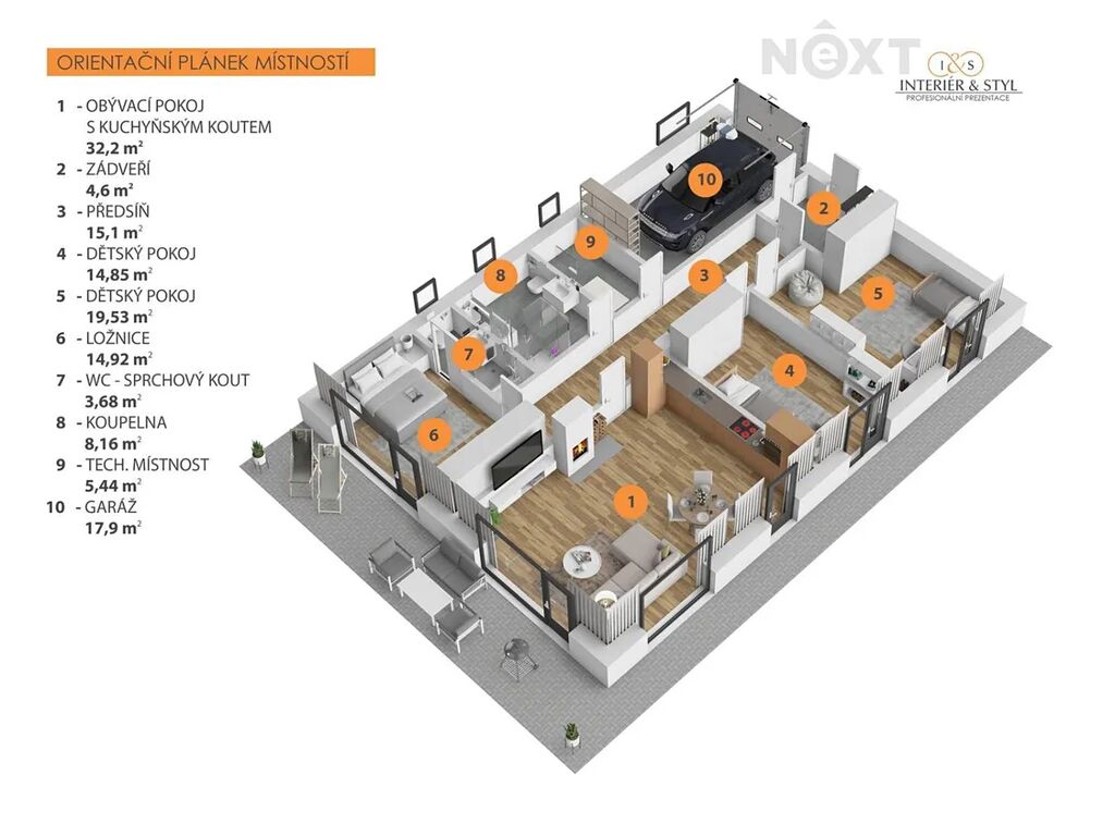 - Špičkové technologie: Šestikomorová plastová okna s izolačním trojsklem od firmy PKS, podlahové vytápění a tepelné čerpadlo pro maximální komfort.