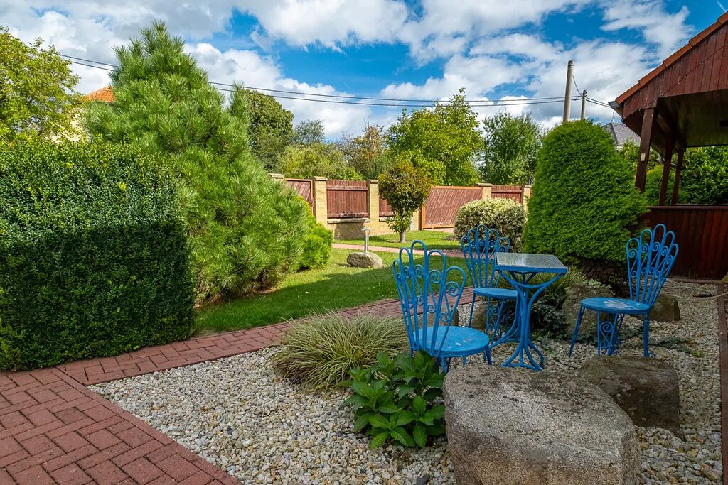 Dům vás přivítá velkou, upravenou zahradou o výměře 1 786 m², kde najdete nejen krásnou zeleň a vzrostlé dřeviny, ale také altán pro příjemné posezení, zahradní domek a sklípek.