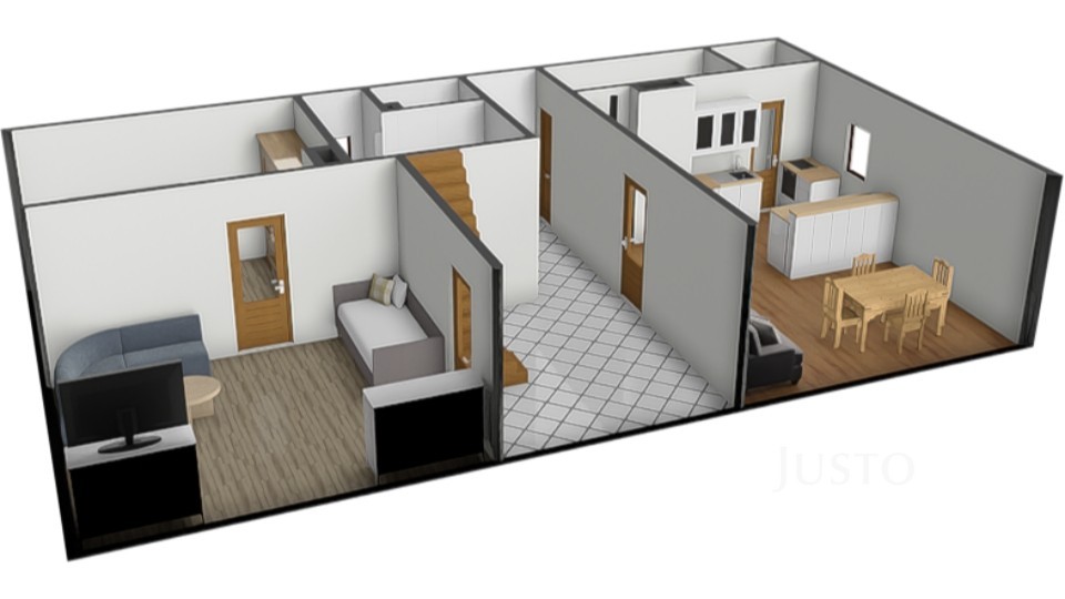 Vstupní hala působí vzdušně a prostorně. Na pravé straně domu se nachází obytná kuchyně se spíží, na levé straně obývací pokoj a ložnice.