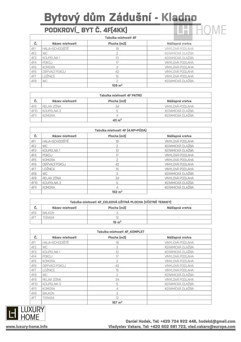 Obytná plocha o výměře 111 m2, balkón o výměře 3 m2, terasa o výměře 8 m2, podkroví o výměře 50 m2, celková plocha celkem 168 m2. K bytu náleží venkovní parkovací místo.