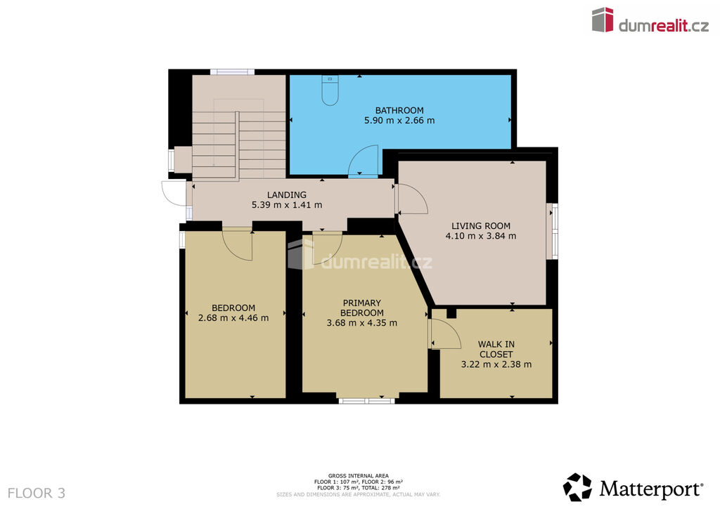 V 1. patře domu se nachází velký obytný prostor s kuchyňským koutem, který navazuje na jeden z menších pokojů. Druhý menší pokoj je přístupný samostatně z chodby. Patro doplňuje koupelna.