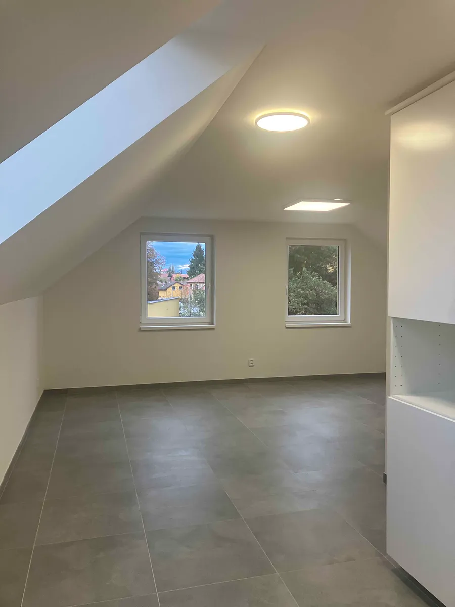 Podkrovní bytová jednotka disponuje novou prostornou kuchyňskou linkou zn. Ikea, v barvě bílá-mat, s dostatkem pracovního i úložného prostoru, vč. nových spotřebičů: indukční varné desky, ele. trouby, digestoře a místa pro myčku nádobí. Prostorná koupelna je dobře větratelná a s denním světlem, naleznete zde vanu, umývadlo, WC, žebřík-topení, přípojku na pračku. Malá chodbička-zádveří. Všechny místnosti jsou osazeny světly. Vytápění: plynový kotel+podlahové topení. Nová plastová okna, nové dveře vč. obložek. Podlaha: kombinace dlažby a plovoucí podlahy v ložnici. Součástí nabídky je také možnost parkování 1 vozidla na společném dvoře, což je v současné době velkou výhodou. Max 2 dospělé osoby, podmínkou nekuřáci a prosíme bez domácích mazlíčků. Prohlídky i možnost nastěhování listopad 2025.