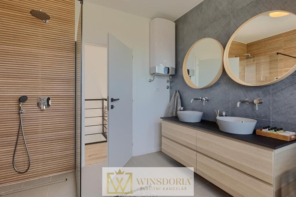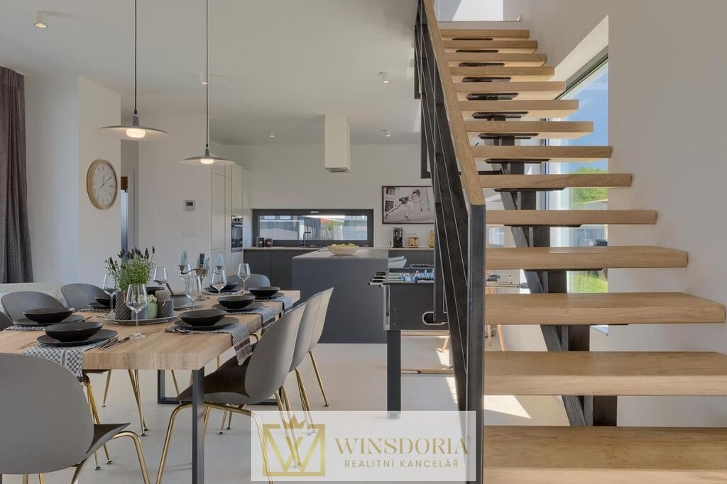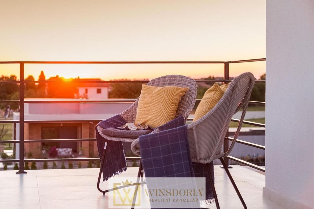 Krytá terasa v přízemí navazuje na bazén a letní kuchyni s posezením. Součástí udržované zahrady je také dětské hřiště a dvě parkovací místa.