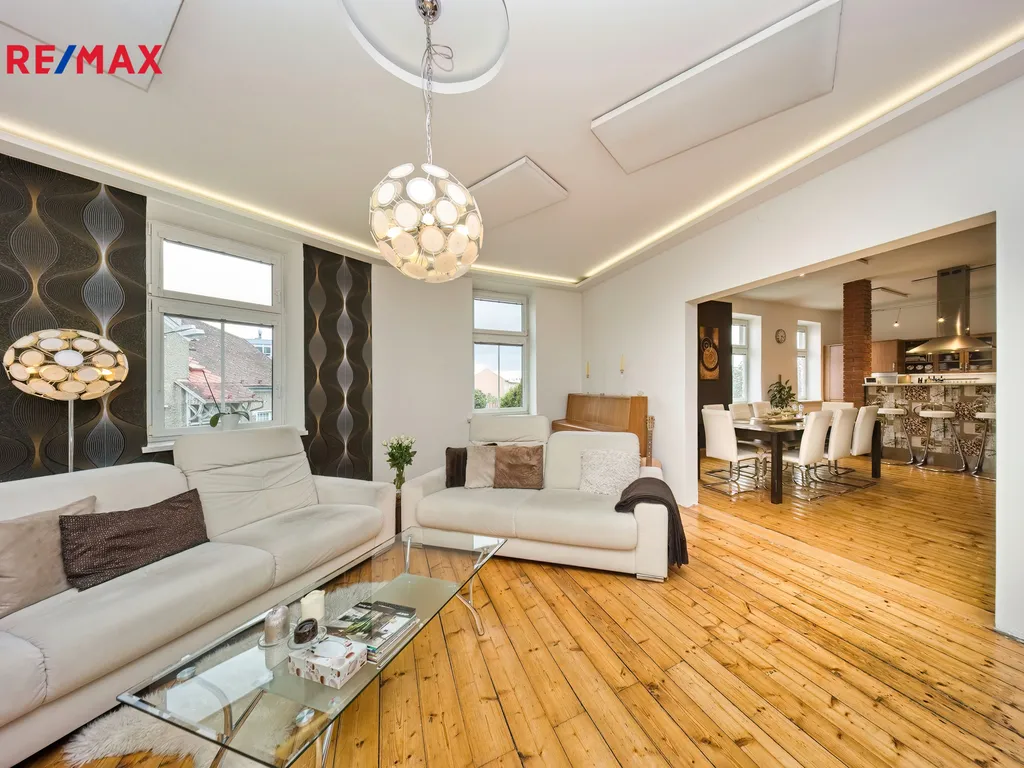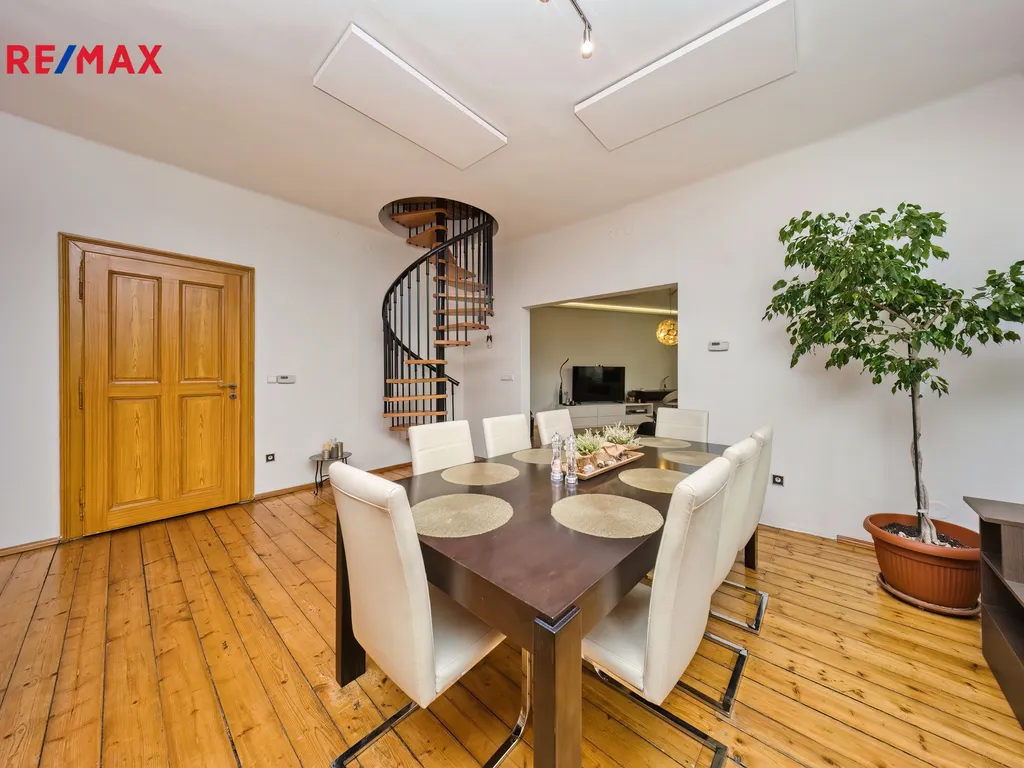 Nabízíme k prodeji mezonetový byt 5+1 s krytým parkovacím stáním, zahradou ve společném užívání (s vyhrazeným soukromým prostorem), terasou a sklepem v osobním vlastnictví o celkové evidované podlahové ploše 189 m². Byt se nachází ve 2. a 3. nadzemním podlaží (z celkem 3 NP) cihlového domu z roku 1919 bez výtahu.