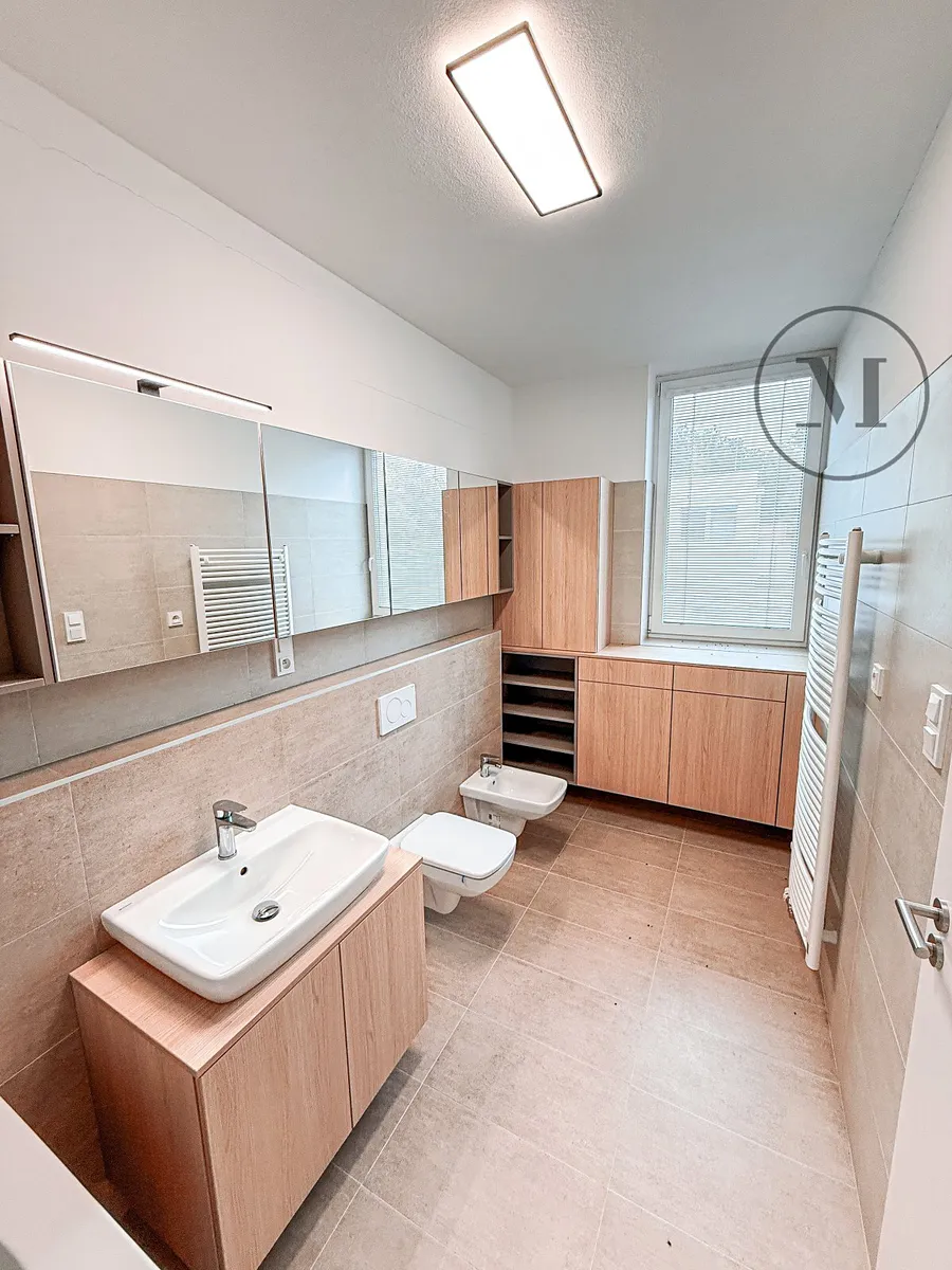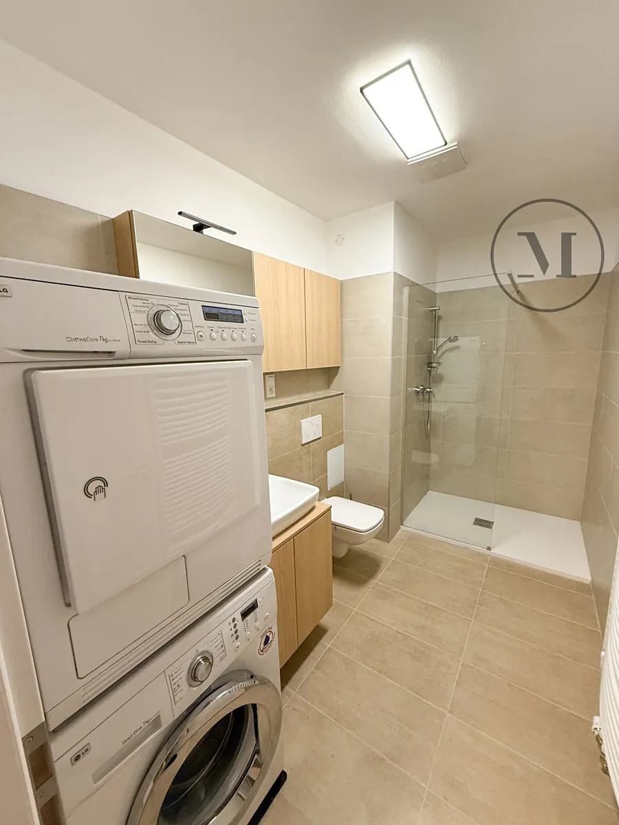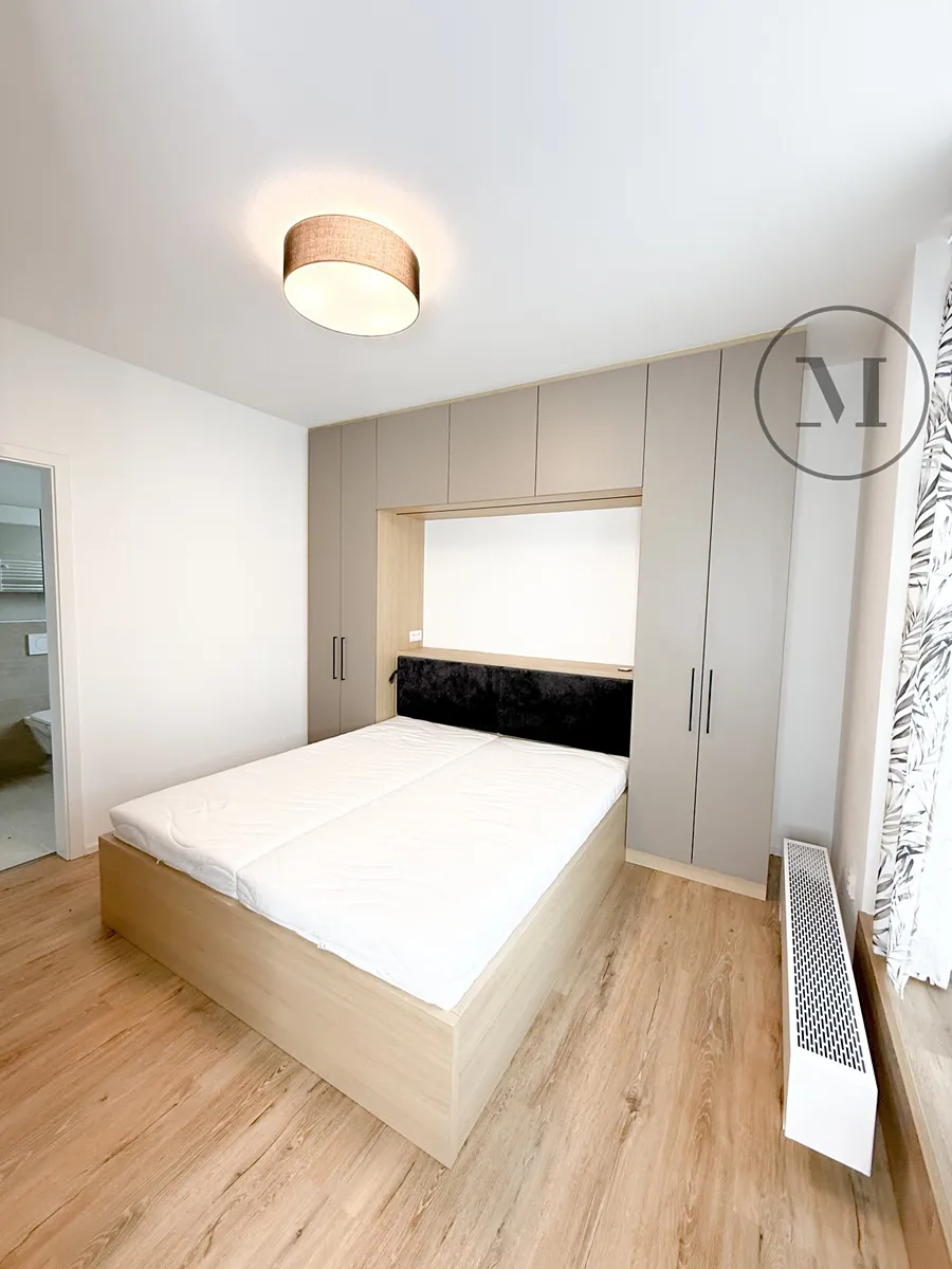 V bytě jsou dvě koupelny. Vestavěné úložné prostory poskytují spoustu místa pro ukládání věcí. Součástí je plně vybavená kuchyňská linka na níž navazuje jídelní stůl se židlemi. Díky velkým oknům je byt po celý den krásně slunný a prosvětlený, což vytváří příjemnou a útulnou atmosféru. Soukromí pak zaručí venkovní žaluzie na elektrický pohon. Vybavení bytu je v nadstandardní kvalitě, což ocení i náročnější klientela.
