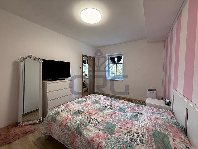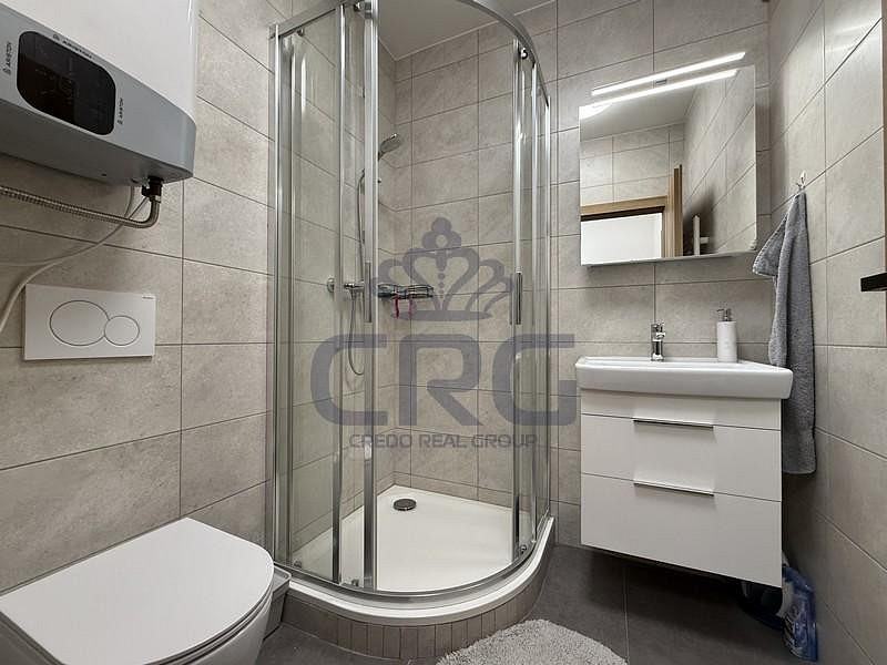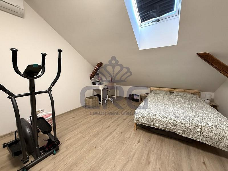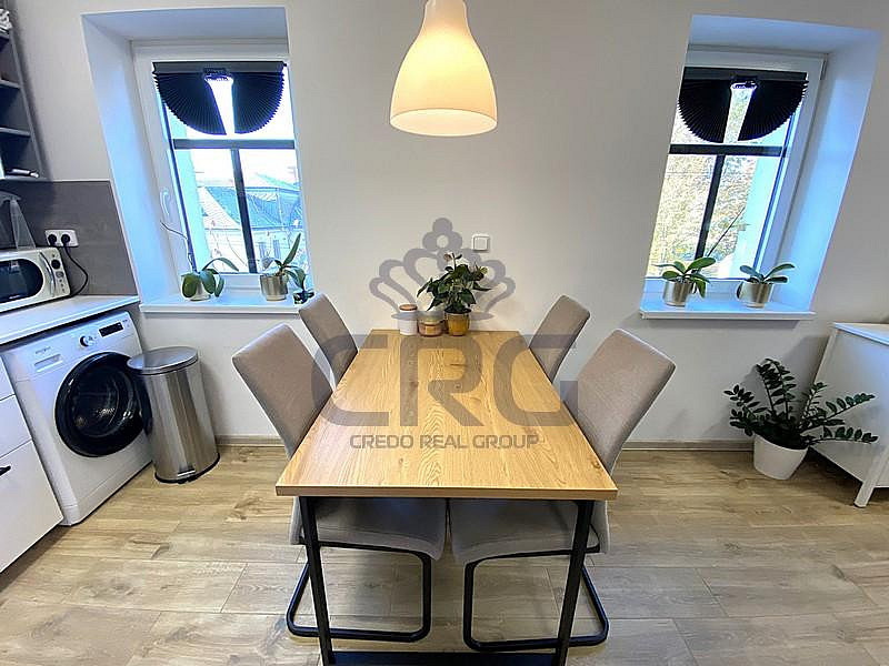 Za vchodovými dveřmi se ocitneme v prostorné chodbě (cca 3,14 m²), ze které je vstup do velké koupelny (cca 2,65 m²). Koupelna s WC je vybavena umyvadlovou skříňkou, umyvadlem, velkým zrcadlem, WC a sprchovým koutem. Hlavní dominantou bytu je pokoj s kuchyňským koutem (cca 24,10 m²), který disponuje novou kuchyňskou linkou, jejíž součástí je digestoř, elektrická trouba, elektrická sklo-keramická deska a pračka. Lednička s mrazákem zde není, ale majitel v případě zájmu lednicí s mrazákem byt dovybaví. V tomto pokoji je také široké točité schodiště vedoucí do mezonetu, kde je pokoj (galerie) o výměře (cca 21,39 m²) s přiznanými trámy a střešním oknem. V místnosti je klimatizace značky LG, která chladí i vytápí. V přízemí nesmíme opomenout ani další samostatný pokoj (cca 13,21 m²), který může sloužit jako obývací, ale i jako ložnice.